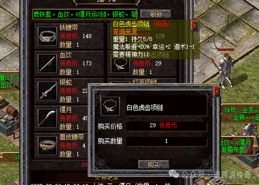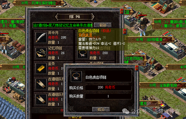 和前面的运2项链相比,上图中的这根白色虎齿项链还多加了1点道术属性上限,对于道士而言在输出方面确实很不错。只不过新百区的道士多是敏捷套装搭配,真正搭配运九套或者十套的很少,因此这根项链属性不错但不热门,就摆摊200了。