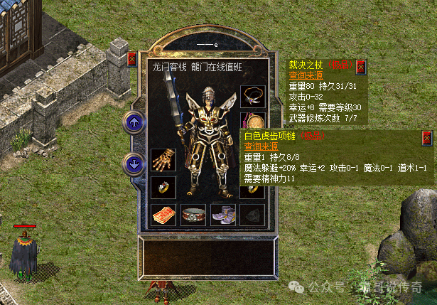 首先瞧瞧那把裁决之杖,升级了2点攻击属性已经让炼狱几乎无法超越了,而加了8点幸运值更是霸气。这还没完,看看那根白色虎齿项链属性真是齐全啊,它不仅加了2点幸运值,还加了1点魔法和1点攻击,加上自带属性之后是适合三职业玩家的通用运2项链,其价值要比其他运2链子或者多加1点主属性的运2链子更胜一筹。