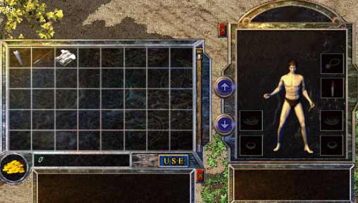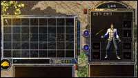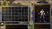 左边就是包裹窗口(F9), 右边是角色装配窗口(F10). 在这里你也许可以看见你强壮的肌肉,不过在这种装配条件下,你是干不了什么的. |